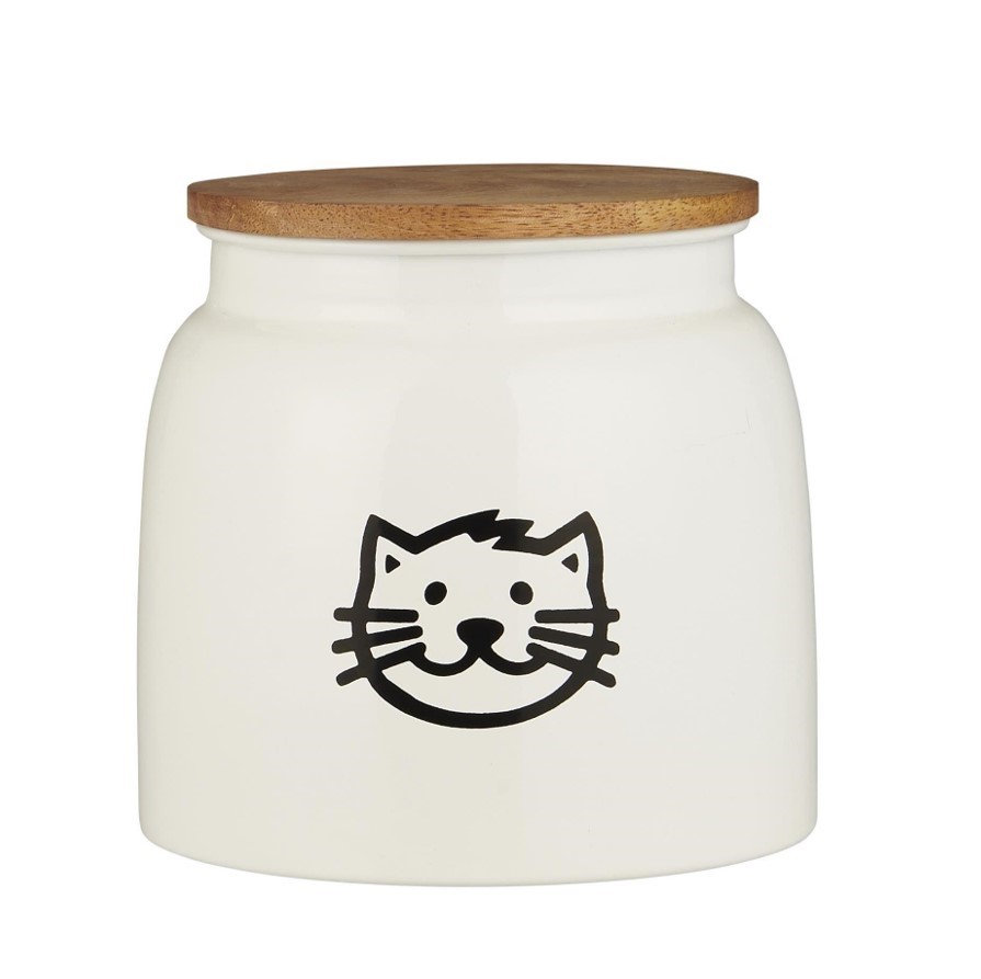 Elegant cat food storage jar that helps keep your cat’s food fresh and protected. Made from white painted metal with a wooden lid that adds a warm, decorative touch. The cat illustration on the front adds a charming detail that fits beautifully into any kitchen or home setting. With a capacity of 2.2 liters, this cat food storage jar is perfectly sized for storing dry cat food, treats, or other small pet supplies.