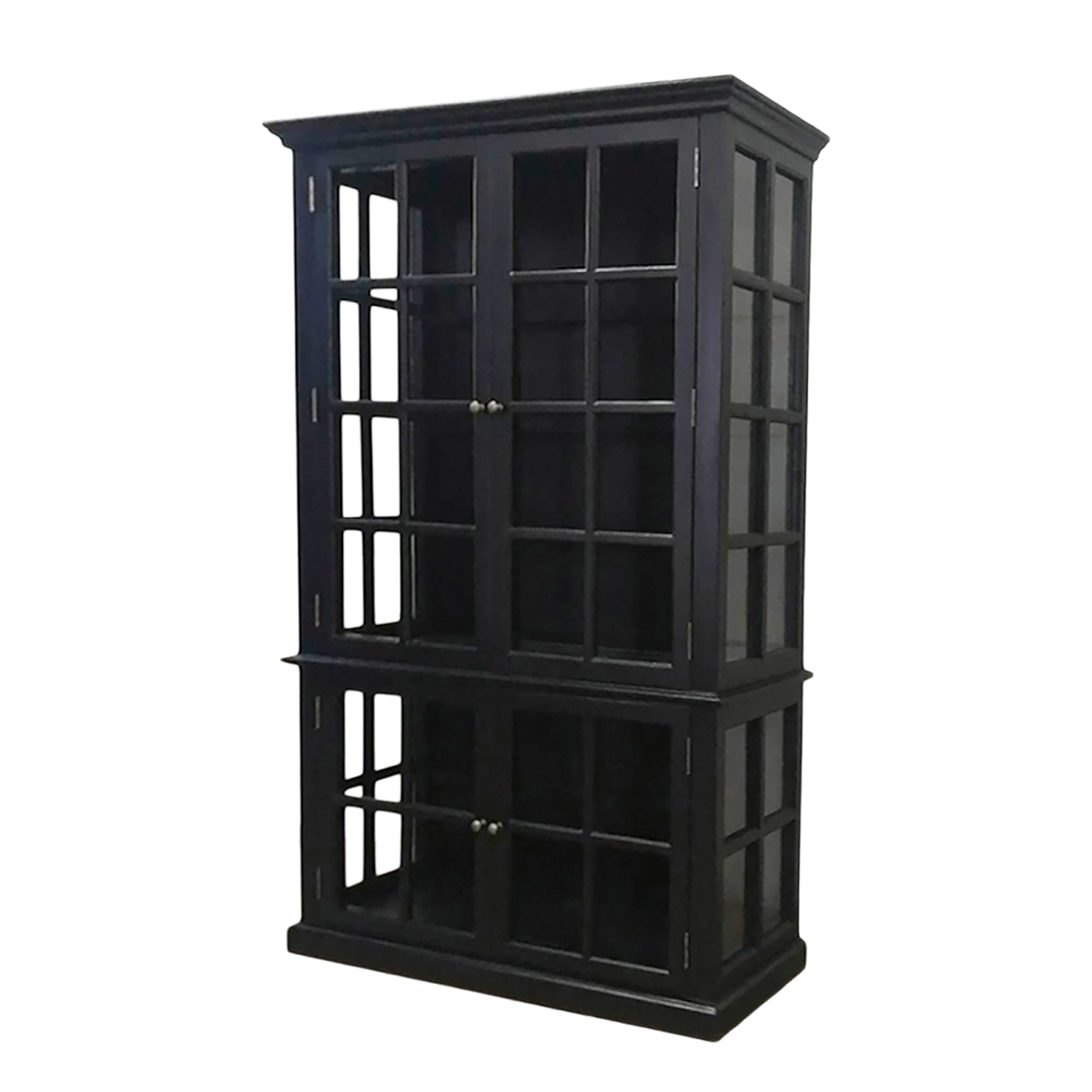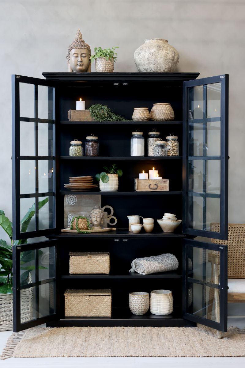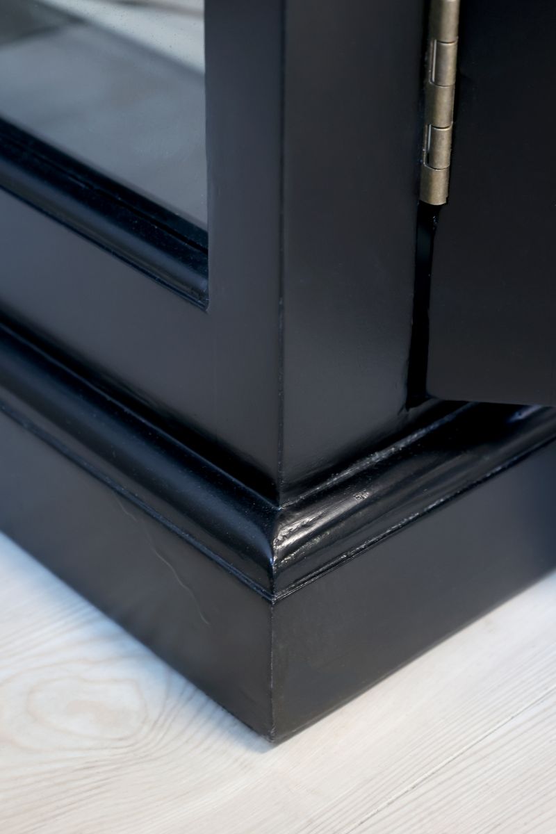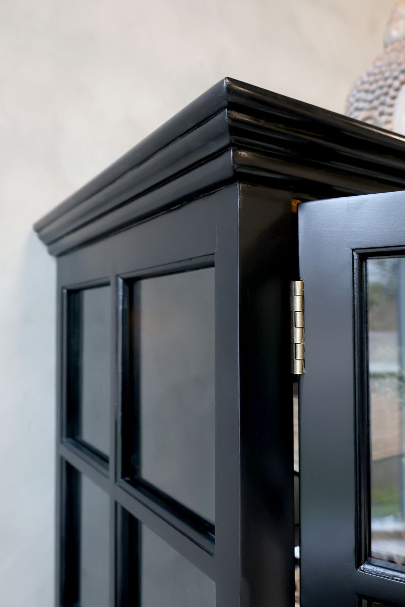 Beautiful handmade display cabinet in solid poplar wood, painted in a deep black sophisticated colour. The four glass doors and spacious shelves provide plenty of space for storing and displaying china, glassware or favourite decorations. The French country style of the display cabinet blends beautifully with a modern home, thanks to the timeless craftsmanship and fine details. Fits in the living room, kitchen or dining room, combining aesthetics and practicality. Each shelf can hold 28 kg.