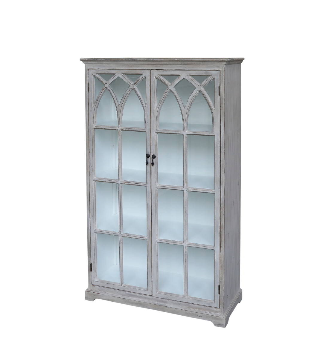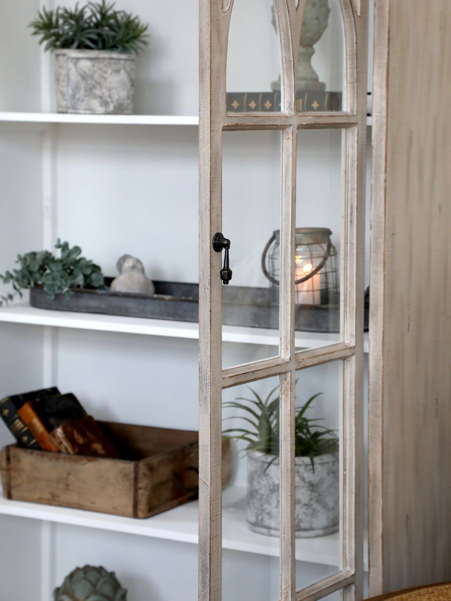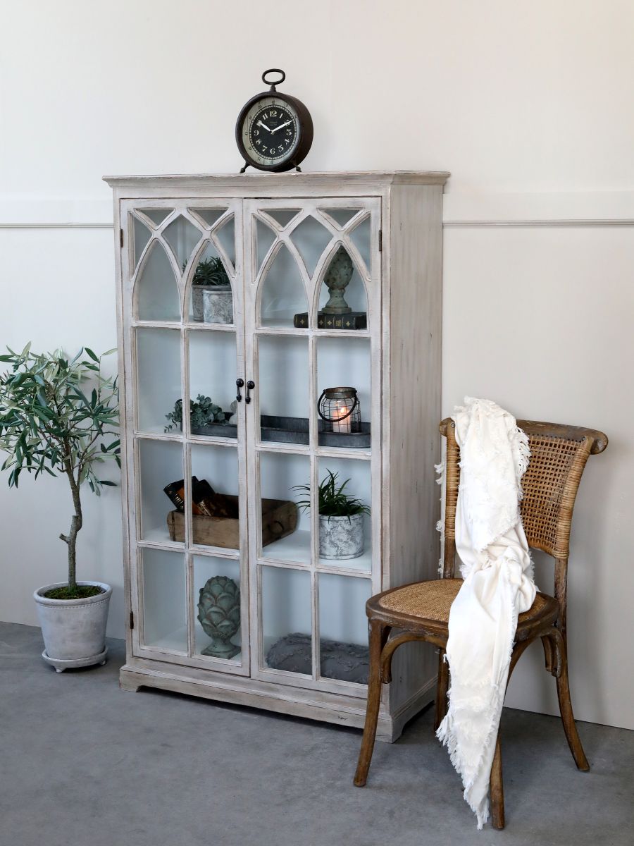 Beautiful sand-coloured display cabinet from Chic Antique. The cabinet has two glass doors with decorative muntins which offers a classic vintage look that fits perfectly with a romantic, French-inspired style. The cabinet doors protect against dust while still allowing your treasures to shine. With its timeless elegance and functional design, this display cabinet is an obvious choice for the living room, dining room, or kitchen—wherever you want stylish and beautiful storage.