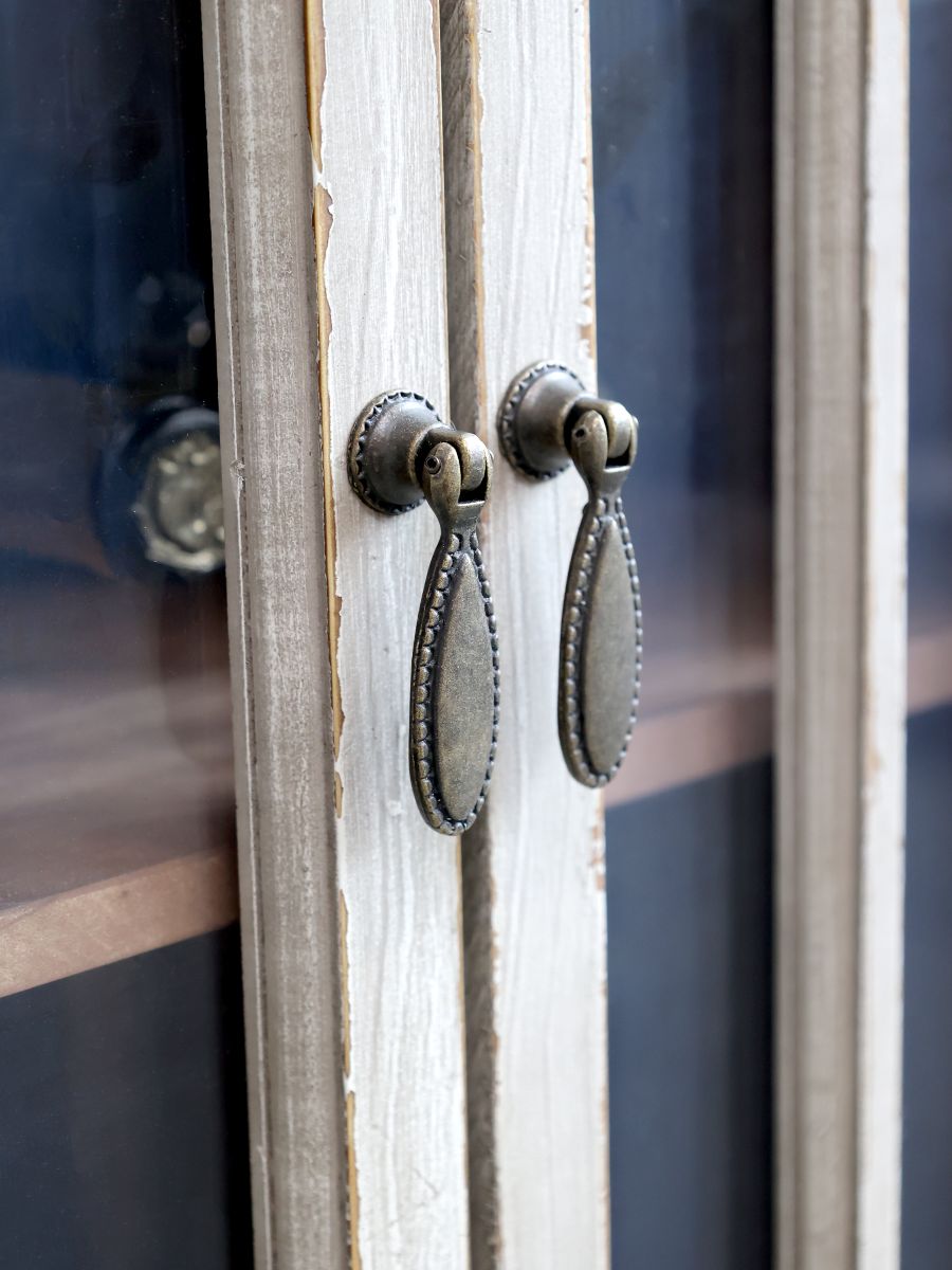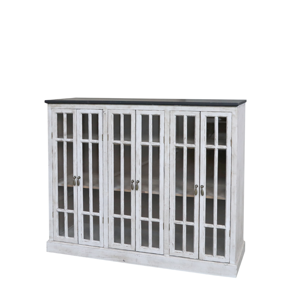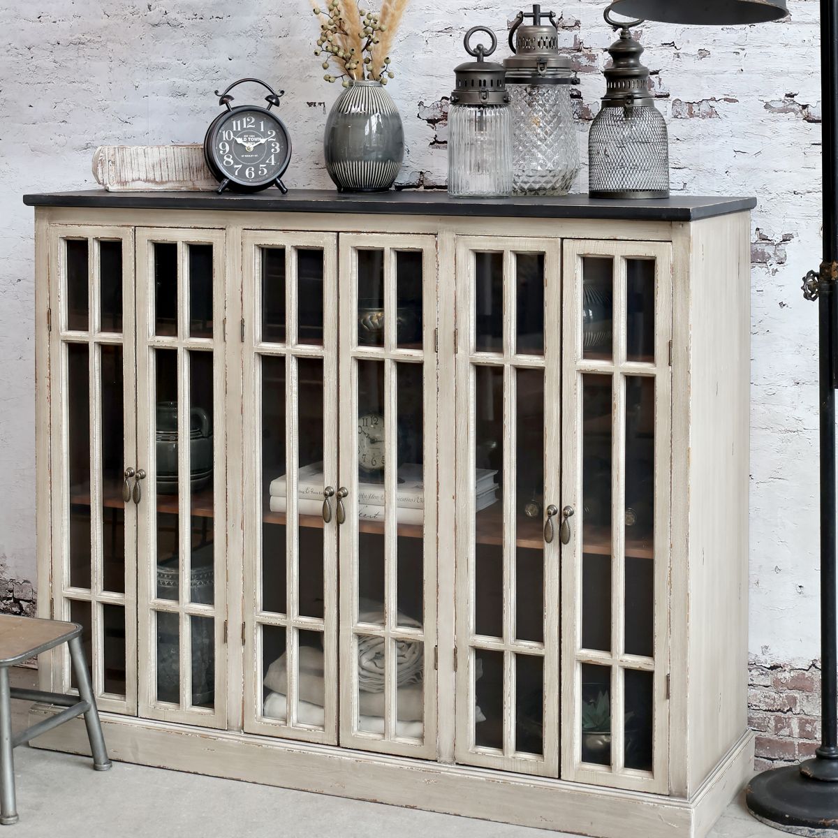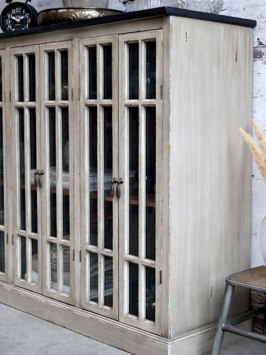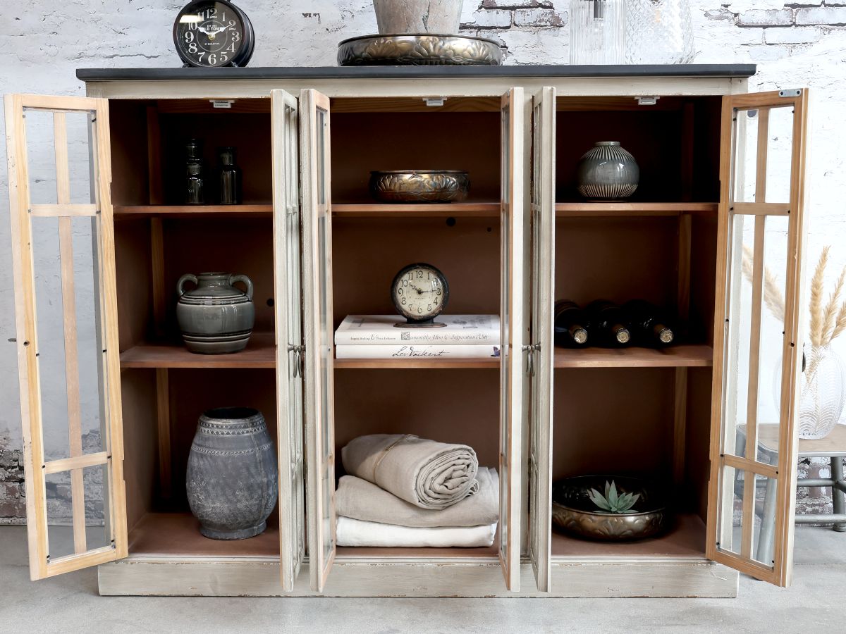Beautiful display cabinet that creates an elegant and timeless feel. The cabinet is made of sturdy pine with a classic sand-coloured finish and a contrasting black top. With its three spacious sections and six vintage-style glass doors, it offers both function and character – perfect for storing and displaying china, books or decorations. The shelves can hold up to 15 kg each.