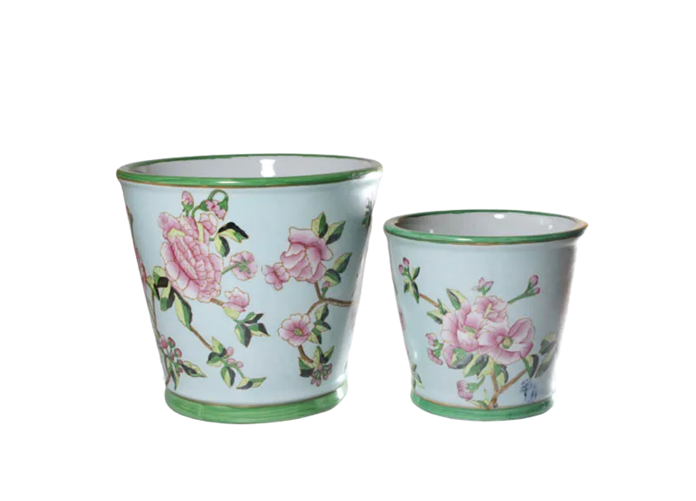 Lovely flower pot in porcelain from Simply Scandinavia. The pot features a beautiful floral motif with pink flowers set against a turquoise background. As the design is hand-painted, slight variations may occur.