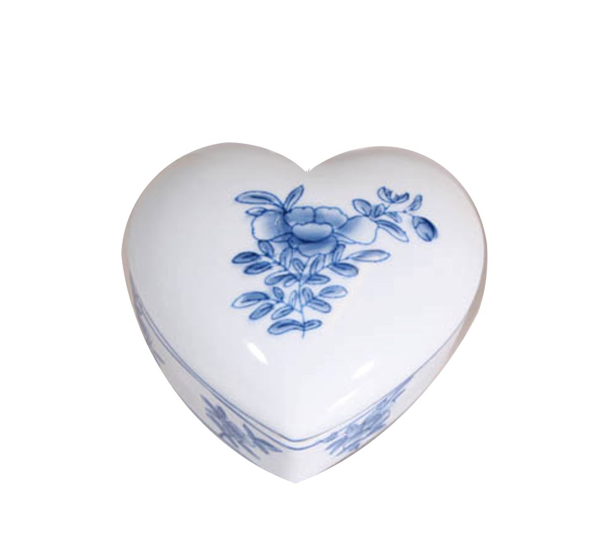 Beautiful porcelain box with lid and a hand-painted motif of a lovely blue flower. The small box is shaped like a heart. The perfect gift for someone you care about.