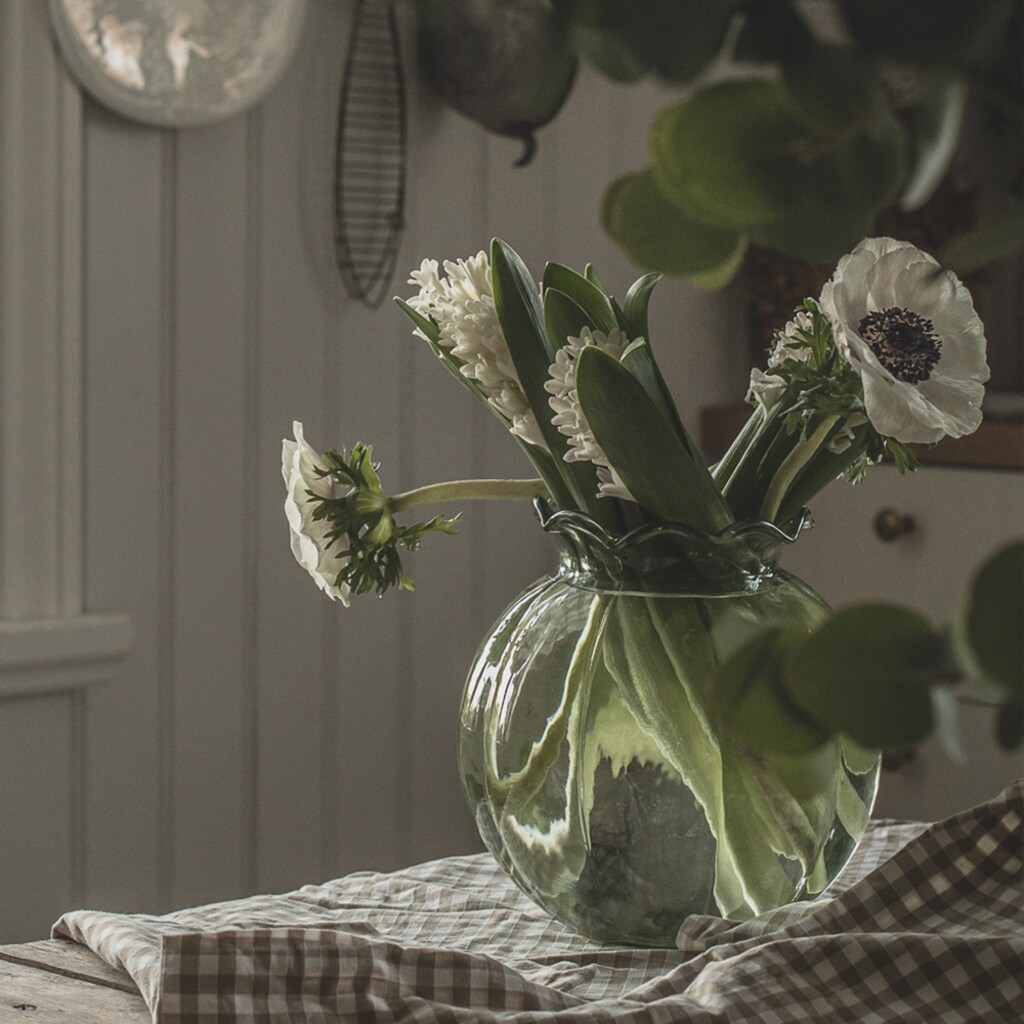 Beautiful round vase from Strömshaga in coloured green glass suitable for both flowers and twigs. Made of 50-60 percent recycled mouth-blown glass.