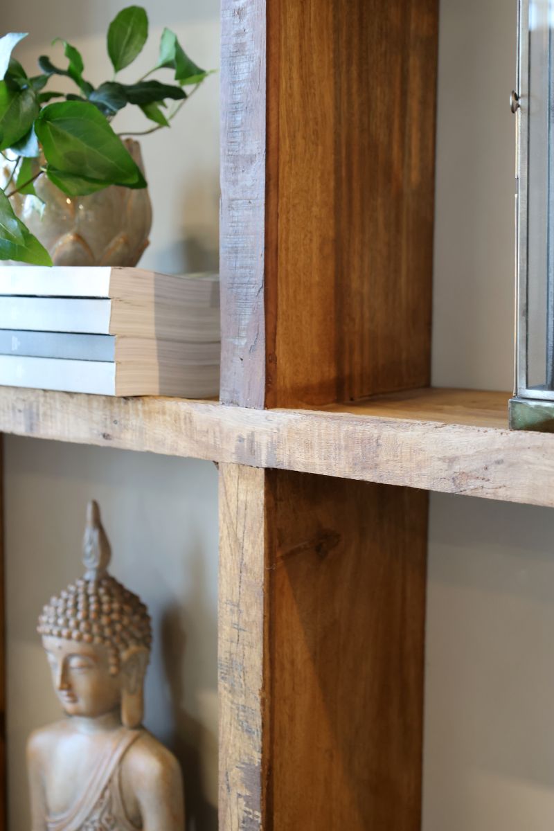 Beautiful wall-mounted bookshelf with six practical compartments. The shelf is made of solid reclaimed wood with a stunning patina and wood grain. Part of Chic Antique’s popular Grimaud series.
